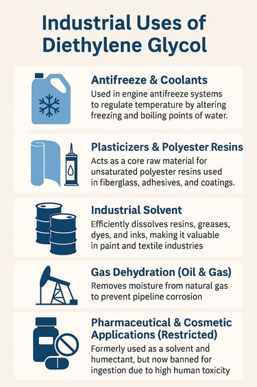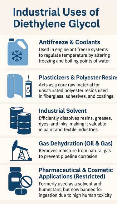 Diethylene Glycol (DEG) mixes completely with water and organic solvents, making it a valuable industrial solvent — but extremely toxic to humans if ingested. Even small amounts can be fatal.